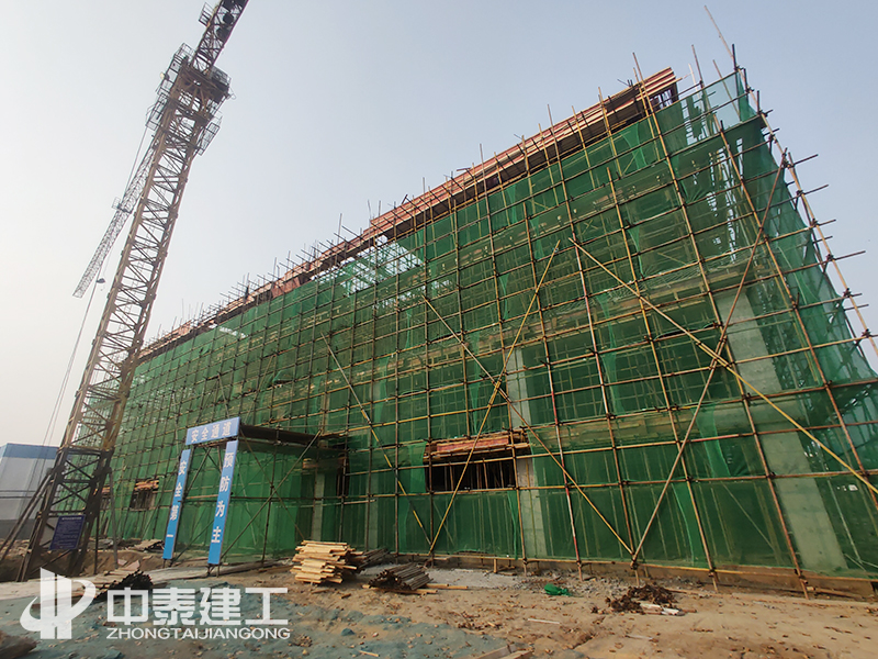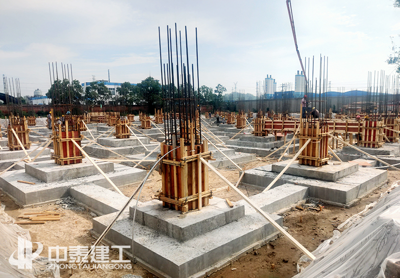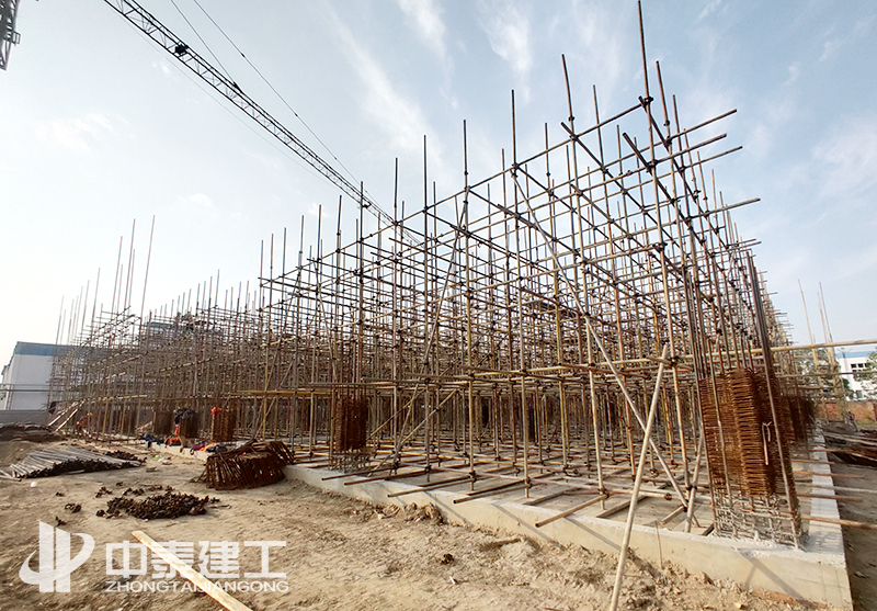 河南項(xiàng)城樂普藥業(yè)股份有限公司原料藥車間項(xiàng)目位于河南省周口市項(xiàng)城市238省道,總建筑面積約為5260.70平方米,占地面積約為2208.09平方米,結(jié)構(gòu)形式為混凝土框架結(jié)構(gòu)組成,主體結(jié)構(gòu)為標(biāo)高為15.60m。 項(xiàng)目于2020年7月25日開工,經(jīng)過前期的不懈努力,在烈日炎炎的環(huán)境下,順利完成場(chǎng)地平整、土方開挖、基礎(chǔ)施工。2020年9、10月間,面對(duì)首層層高7.5米和二層層高超過8米的不利條件下,中泰建工嚴(yán)格按照經(jīng)專家論證通過的高大支模方案進(jìn)行模板施工,認(rèn)真檢查支撐體系。確保達(dá)到施工的安全情況下,順利完成模架支撐體系搭設(shè)。于2020年11月16日順利完成結(jié)構(gòu)封頂。