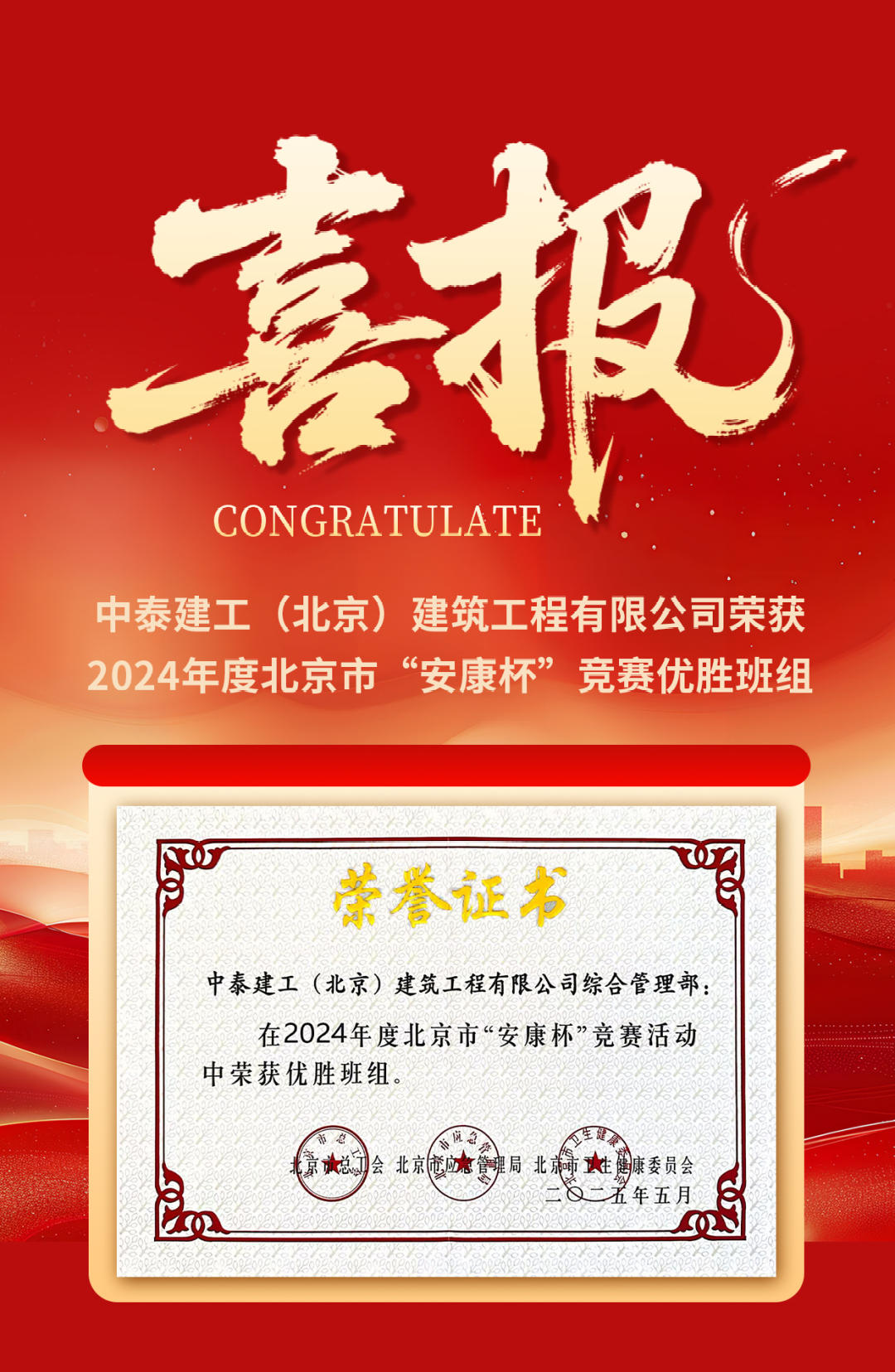 喜報(bào) | 中泰建工榮獲2024年度北京市“安康杯”競賽優(yōu)勝班組