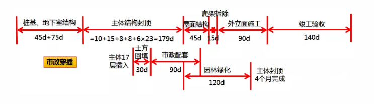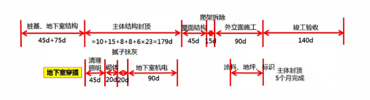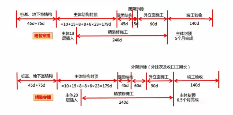 精裝進(jìn)場時(shí)間:=N/n+28/6+1=11層精裝完成時(shí)間:=19*6+(M-1) *6 =150天(相對主體結(jié)構(gòu)封頂)