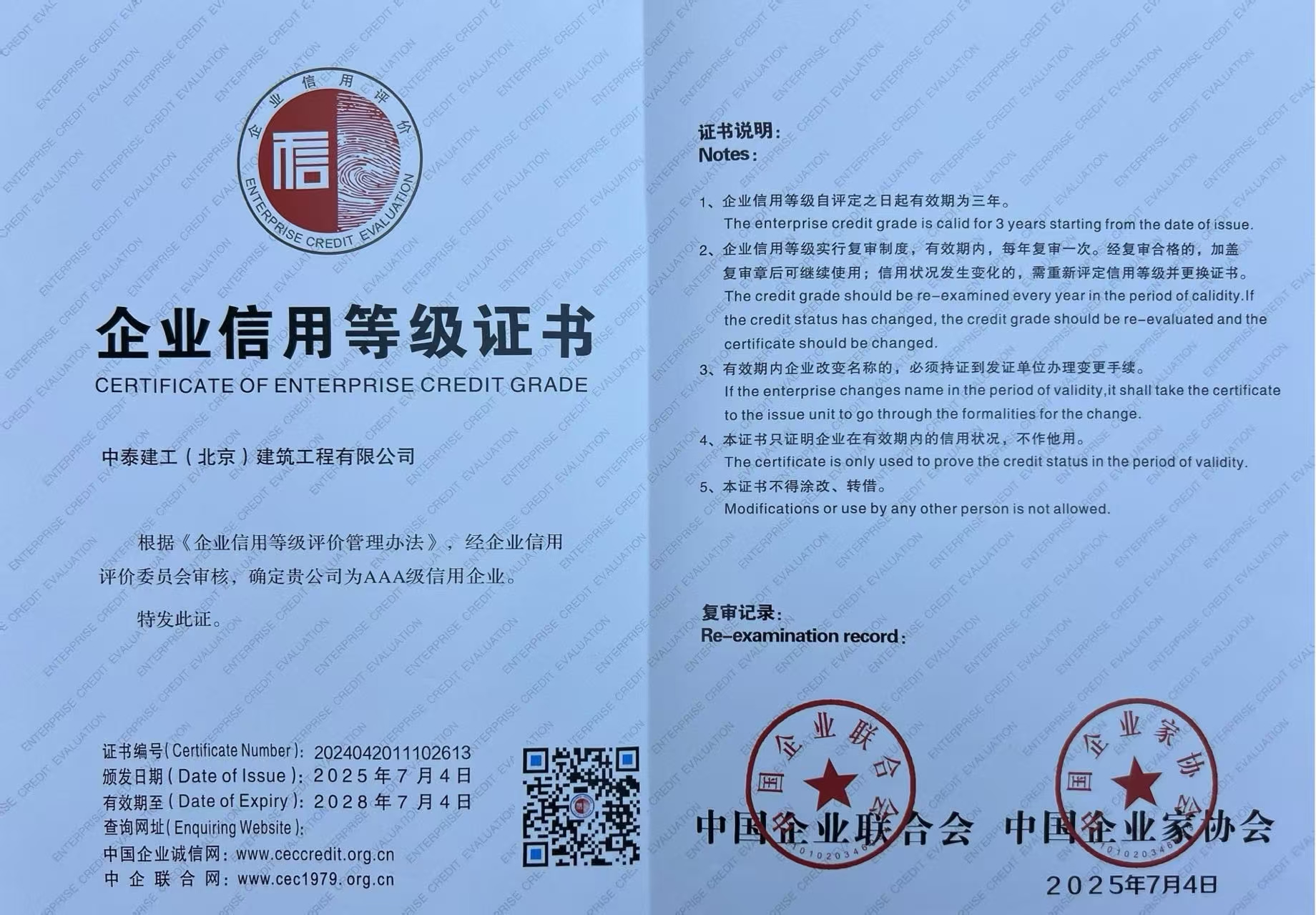 中國企業(yè)聯(lián)合會(huì)、中國企業(yè)家協(xié)會(huì)企業(yè)信用評(píng)價(jià)由基礎(chǔ)信用能力、經(jīng)營與競爭等5個(gè)一級(jí)指標(biāo)及若干二、三級(jí)指標(biāo)組成,全面綜合考核企業(yè)誠信建設(shè)與信用管理能力和水平,旨在提高企業(yè)誠信建設(shè)水平,推動(dòng)企業(yè)誠信自律,提升企業(yè)管理水平。評(píng)價(jià)體系信用等級(jí)分為三等五級(jí),其中AAA級(jí)為最高等級(jí),代表著企業(yè)在信用建設(shè)方面的卓越表現(xiàn),信用評(píng)價(jià)等級(jí)結(jié)果已成為企業(yè)經(jīng)營發(fā)展和獲得市場認(rèn)可的誠信標(biāo)志。 信用是企業(yè)發(fā)展的基石,也是市場合作的紐帶。公司自成立以來,始終以“信守承諾、勇于擔(dān)當(dāng)”為準(zhǔn)則,嚴(yán)格履行合同約定,保證工程質(zhì)量、安全生產(chǎn)。憑借高效的項(xiàng)目管理和“一次合作,終生服務(wù)”的理念,贏得了客戶的信賴與贊譽(yù)。