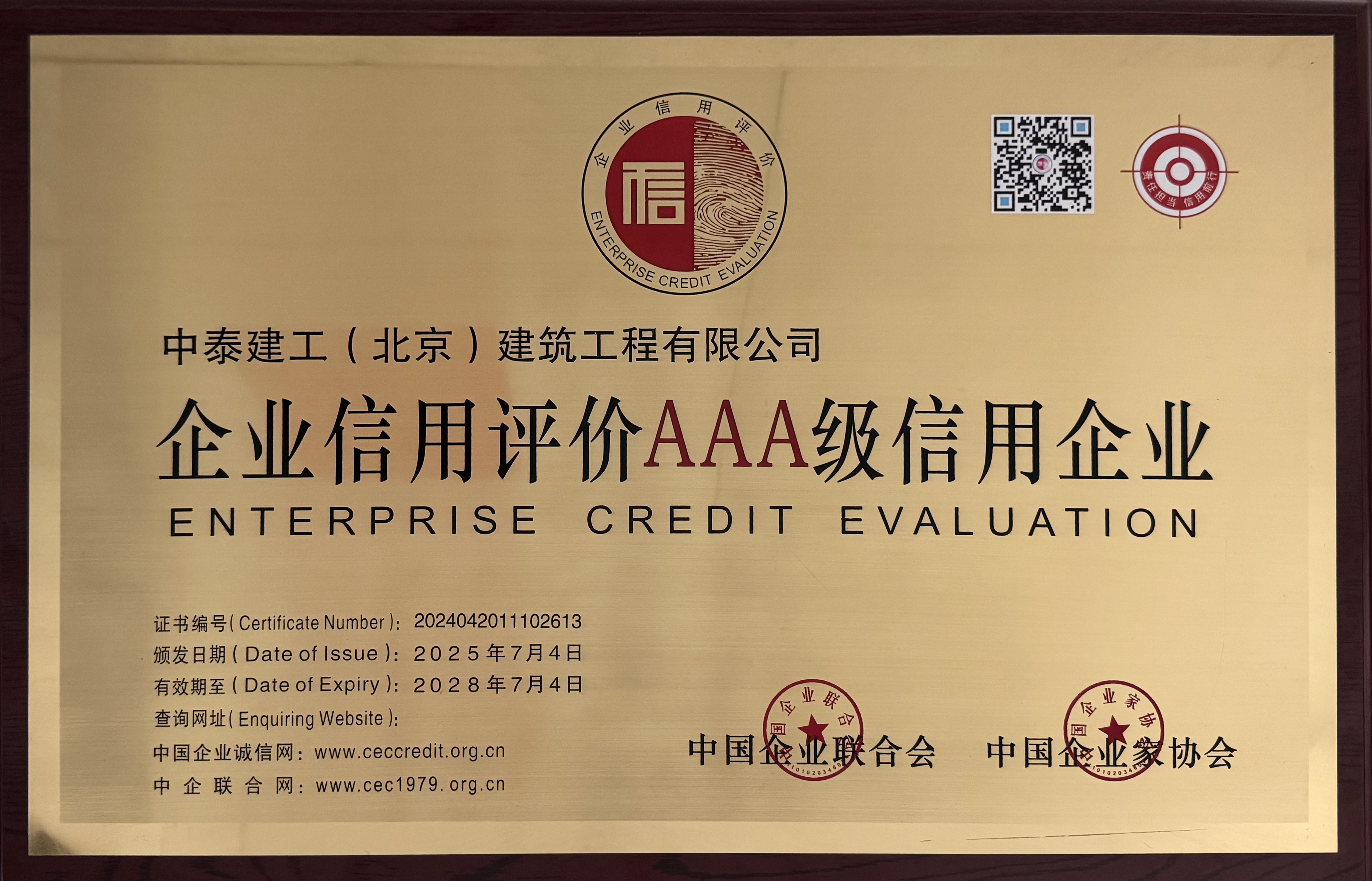 一次合作 終生服務(wù) 近日,中國企業(yè)聯(lián)合會(huì)、中國企業(yè)家協(xié)會(huì)正式公布AAA級(jí)信用企業(yè)名單”,中泰建工(北京)建筑工程有限公司憑借穩(wěn)健的經(jīng)營實(shí)力、良好的履約記錄與卓越的信用管理水平,成功榮獲“AAA級(jí)信用企業(yè)”認(rèn)證!這一榮譽(yù)不僅是對(duì)企業(yè)綜合實(shí)力的高度認(rèn)可,更是對(duì)我們多年來堅(jiān)守“誠信經(jīng)營”的最佳見證。 中國企聯(lián)黨委委員、駐會(huì)副會(huì)長梁彥為中泰建工頒發(fā)榮譽(yù)資質(zhì),中泰建工黨支部書記趙立國代表公司領(lǐng)取牌匾及榮譽(yù)證書。中國企聯(lián)雇主工作部主任張文濤、中國企聯(lián)雇主工作部副主任馬超、北京企業(yè)聯(lián)合會(huì)副會(huì)長王翠霞出席授牌儀式。