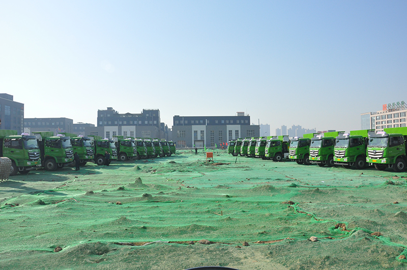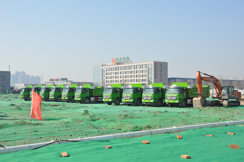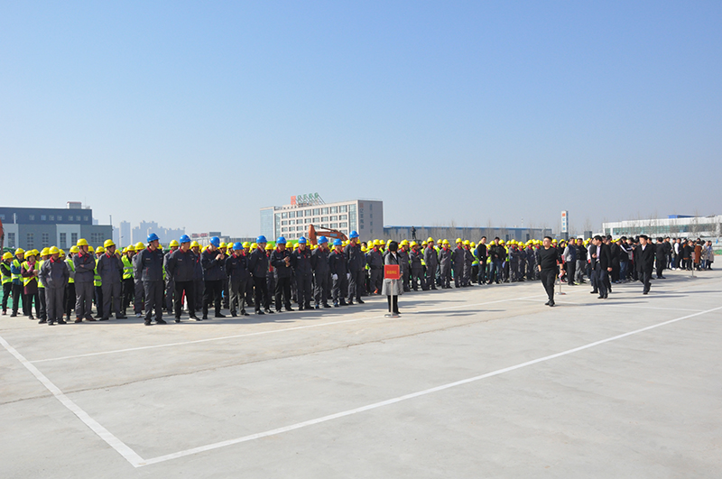 在三河市重點項目集中開工現場會會場,大型機械裝備整齊排列,工人們整裝待發(fā)。